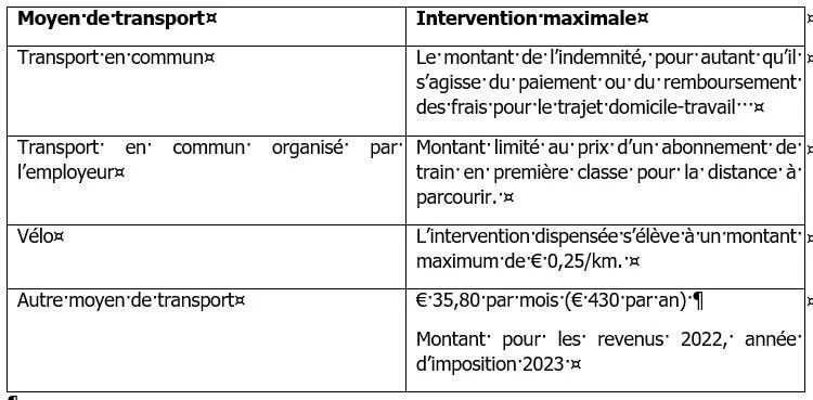 Si l’employé se rend à son travail par ses propres moyens (et donc ne dispose pas d’un moyen de transport mis à disposition par l’employeur), il peut alors, selon les conditions sectorielles concernées, demander une intervention dans les frais de déplacements qui sont à charge de l’employeur. Le montant de l’intervention dépend du type de transport utilisé et de la distance domicile-travail. Pour ce faire, vous êtes tenu de faire remplir une déclaration sur l’honneur à votre travailleur.